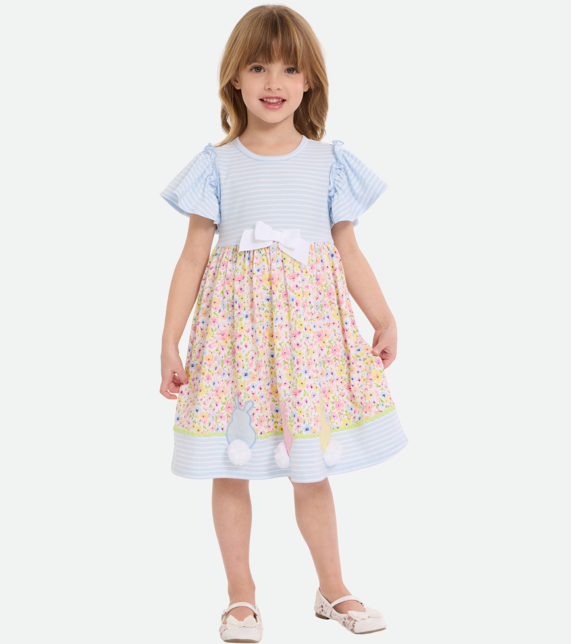 Hop into Easter fun in the Bonnie Bunny Tail Dress! Featuring a striped knit and floral print, bunny appliques and fluffy 3D cotton tails and flutter sleeves.