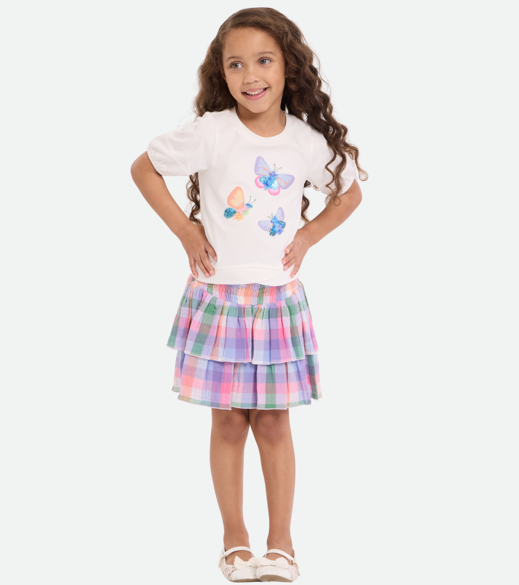 Welcome warmer days in this play-ready butterfly skirt set! The Maisie Two-Piece Set features a short sleeved top with glittery butterfly appliques and a coordinating smocked waist plaid tiered skirt.