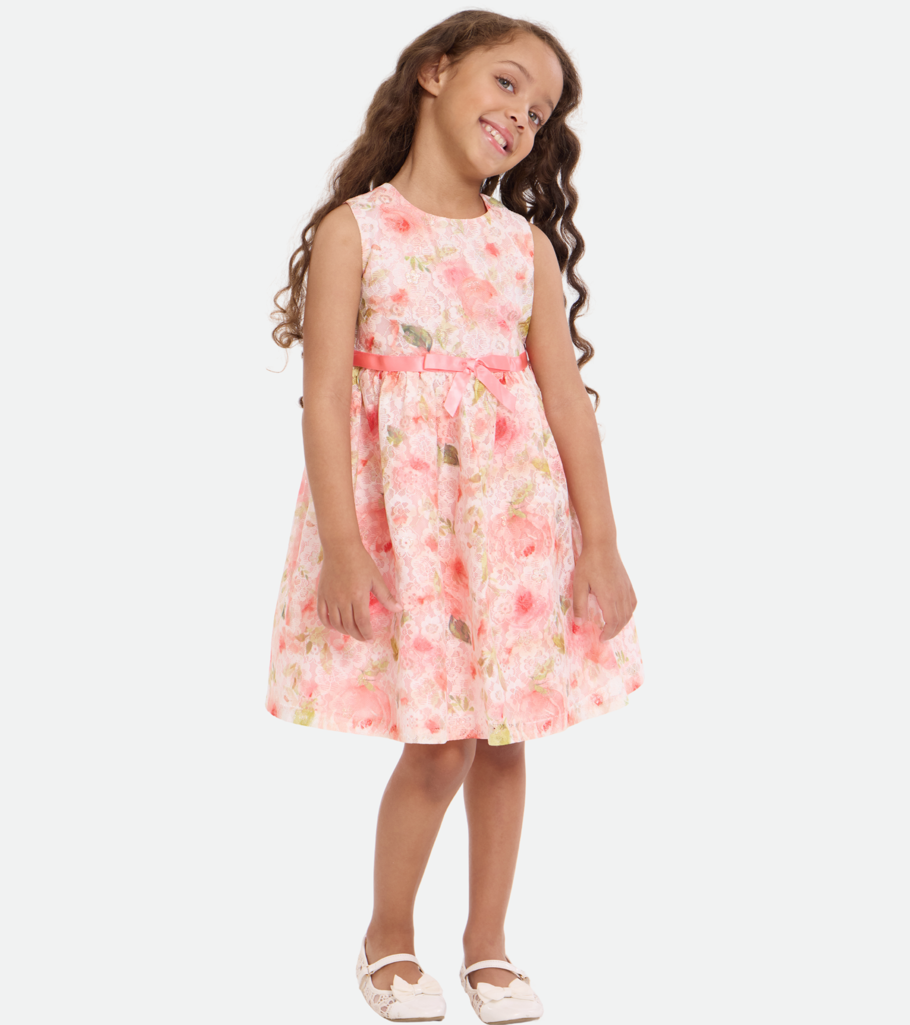 The perfect outfit for her next spring event! The Mila Set features a textured knit coat with pinafore ruffles over a dainty printed lace floral dress with band and bow at the waist.