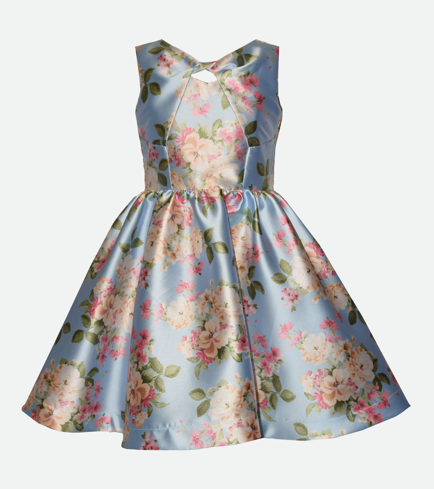 Timeless and oh so elegant, This Mikado party dress features stunning spring florals alongside a unique twist bodice, bow back, and a twirl-worthy skirt that it the perfect choice for her next spring occasion!