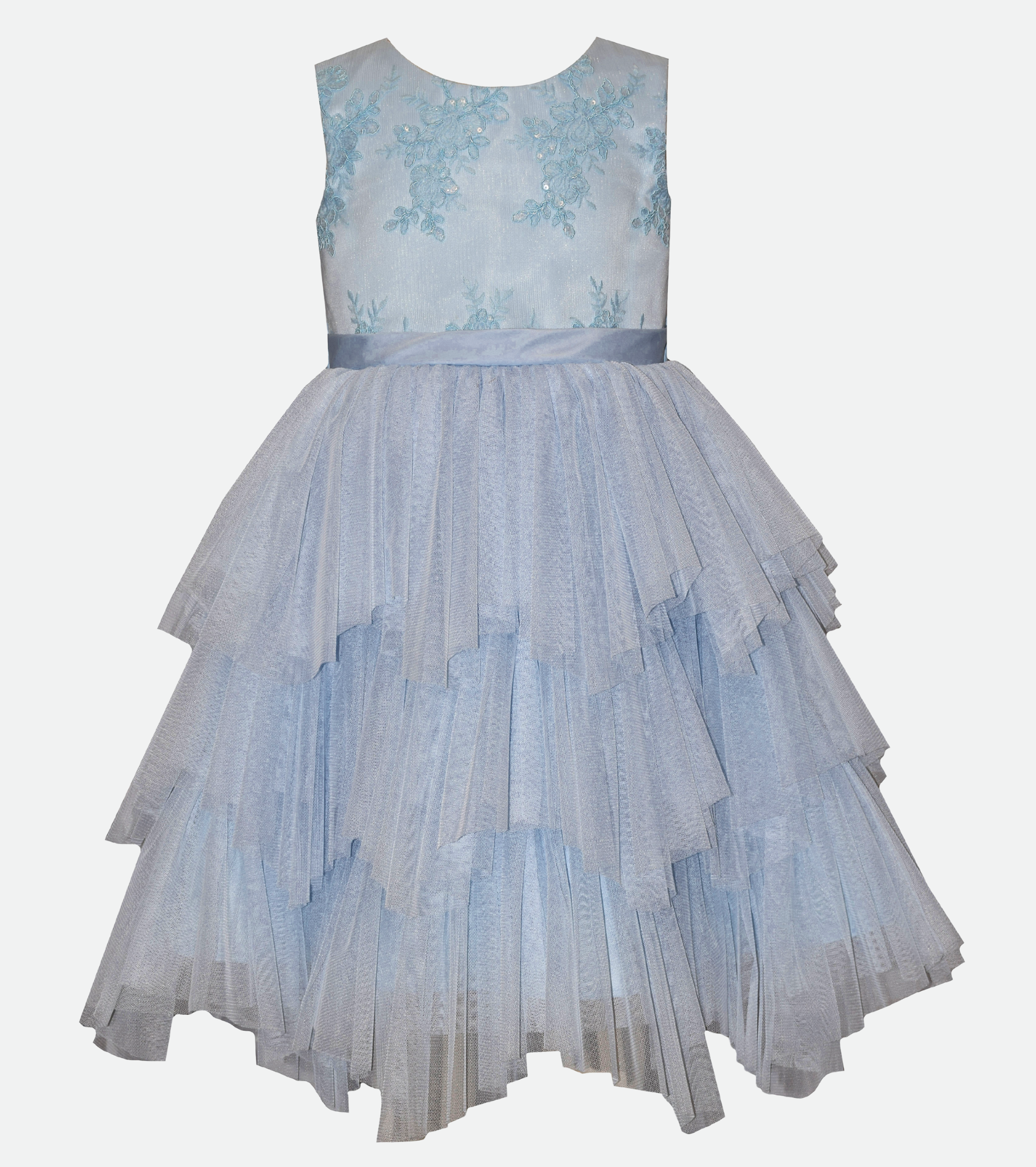 The ultimate twirl-worthy party dress for any spring occasion! The Willow Party Dress features a sleeveless bodice with tonal floral sequin embroidery and an oh-so fun tiered mesh skirt with a fairy hem and satin waist band.