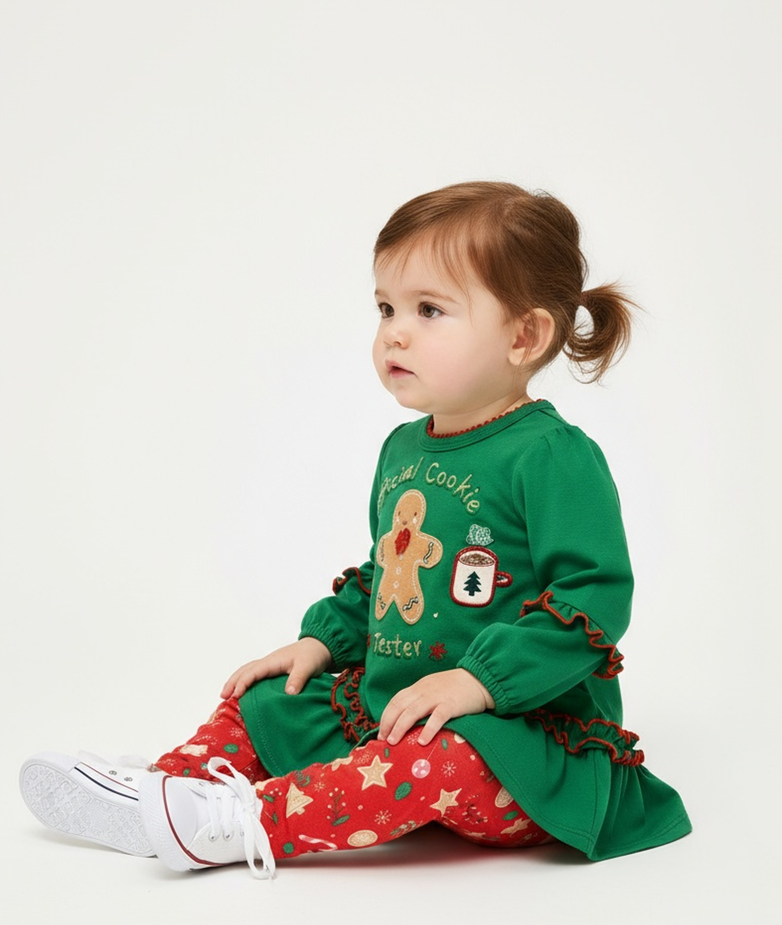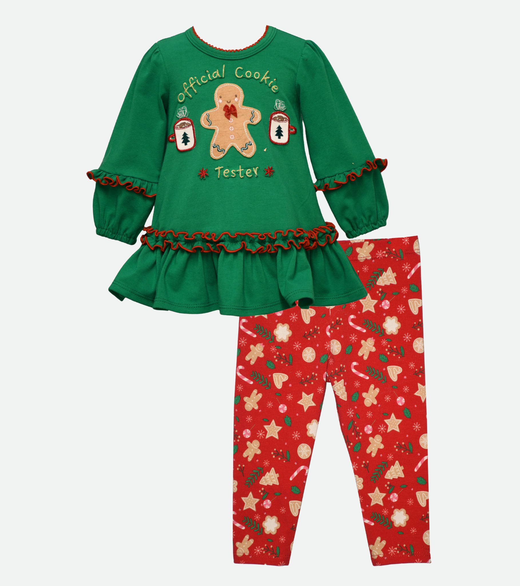 The sweetest holiday outfit for your little cookie monster! Long sleeved knit top with flounced hem, contrasting ruffles and gingerbread applique to knit cookie print legging.