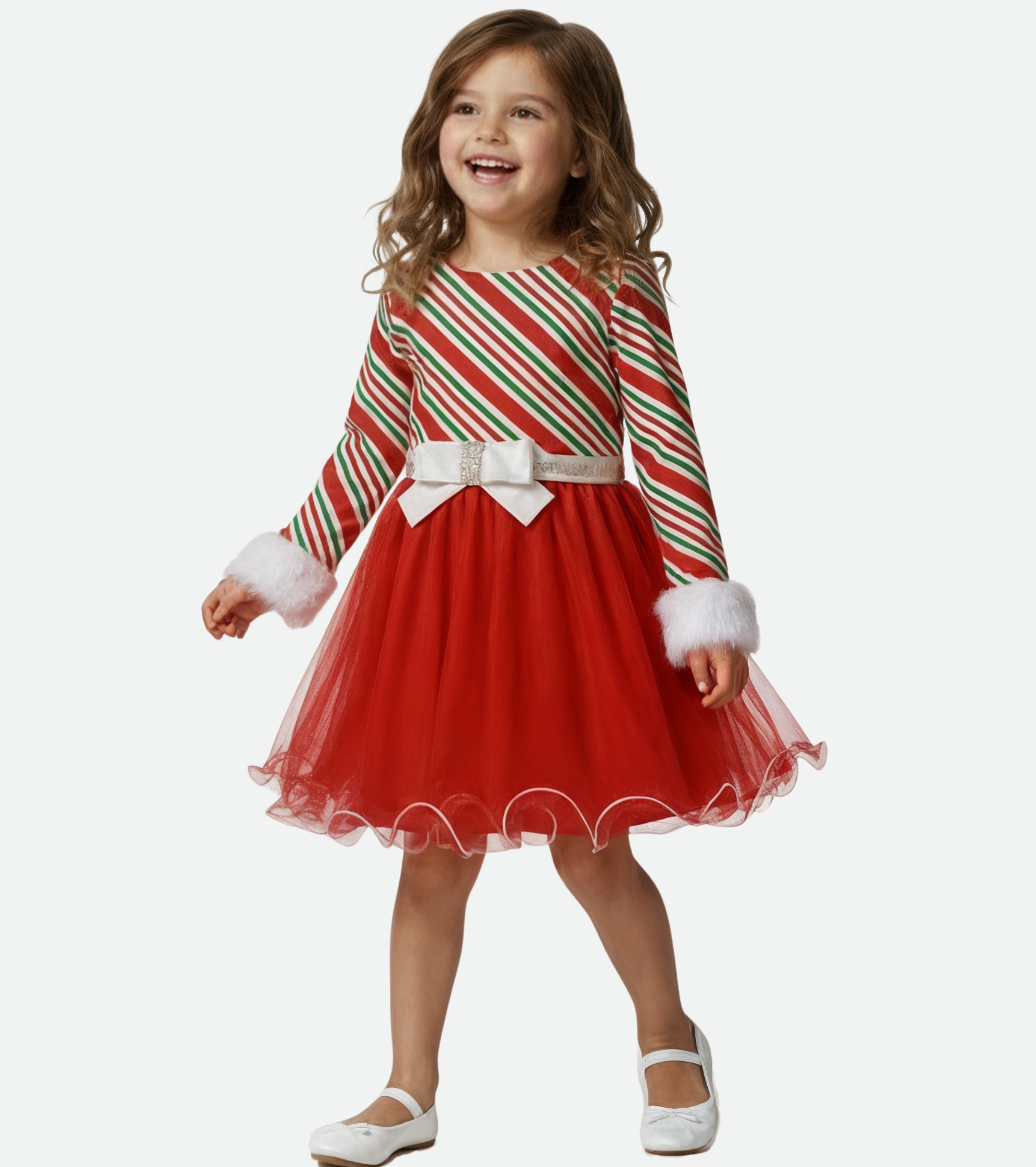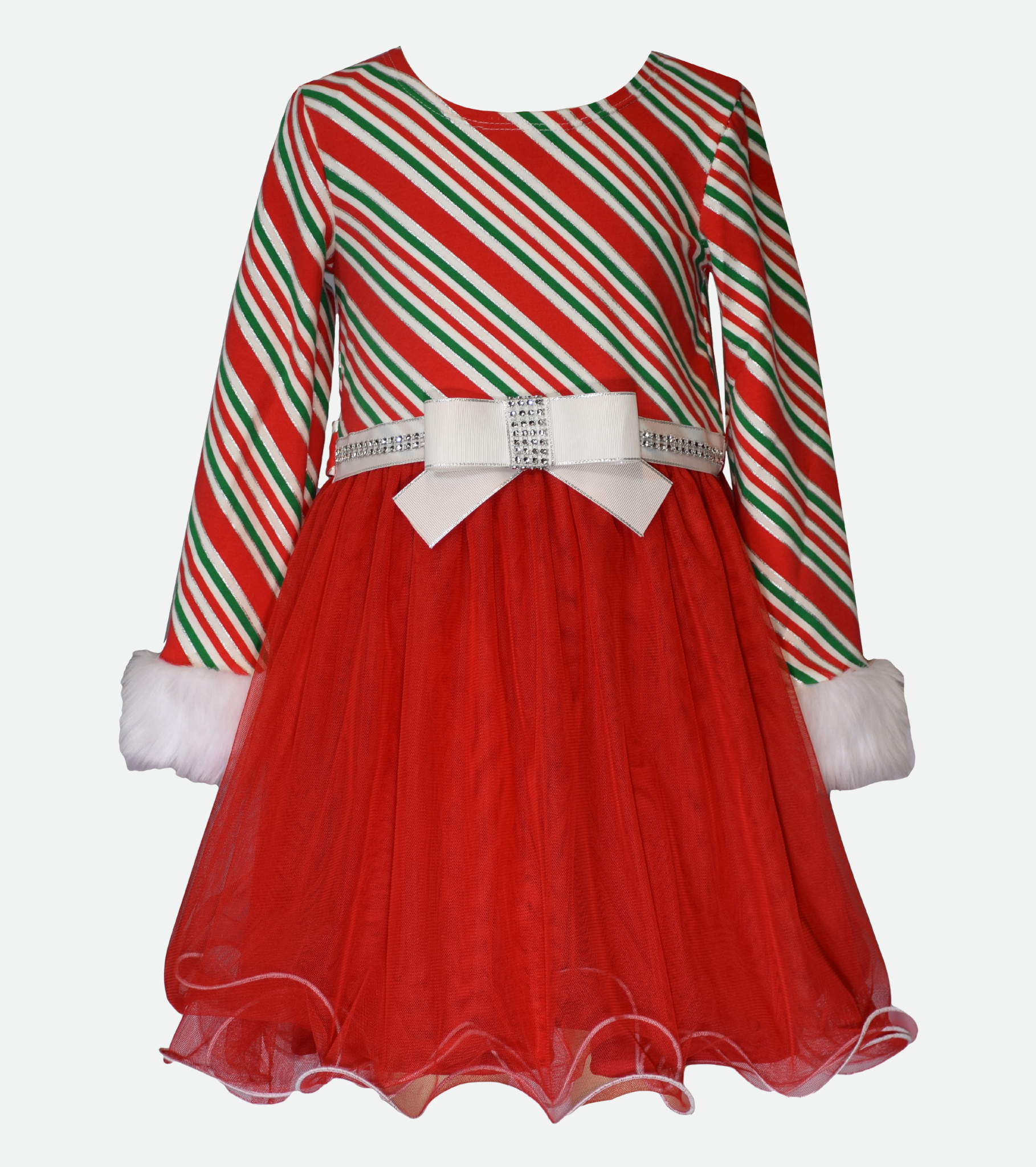 The perfect look for her next Christmas party or festive occasion, the Cassie Dress features a festive candy cane stripe knit bodice and a twirl-worthy mesh wire hem skirt. Faux fur cuffs and a sparkling waist bow add an extra special touch!