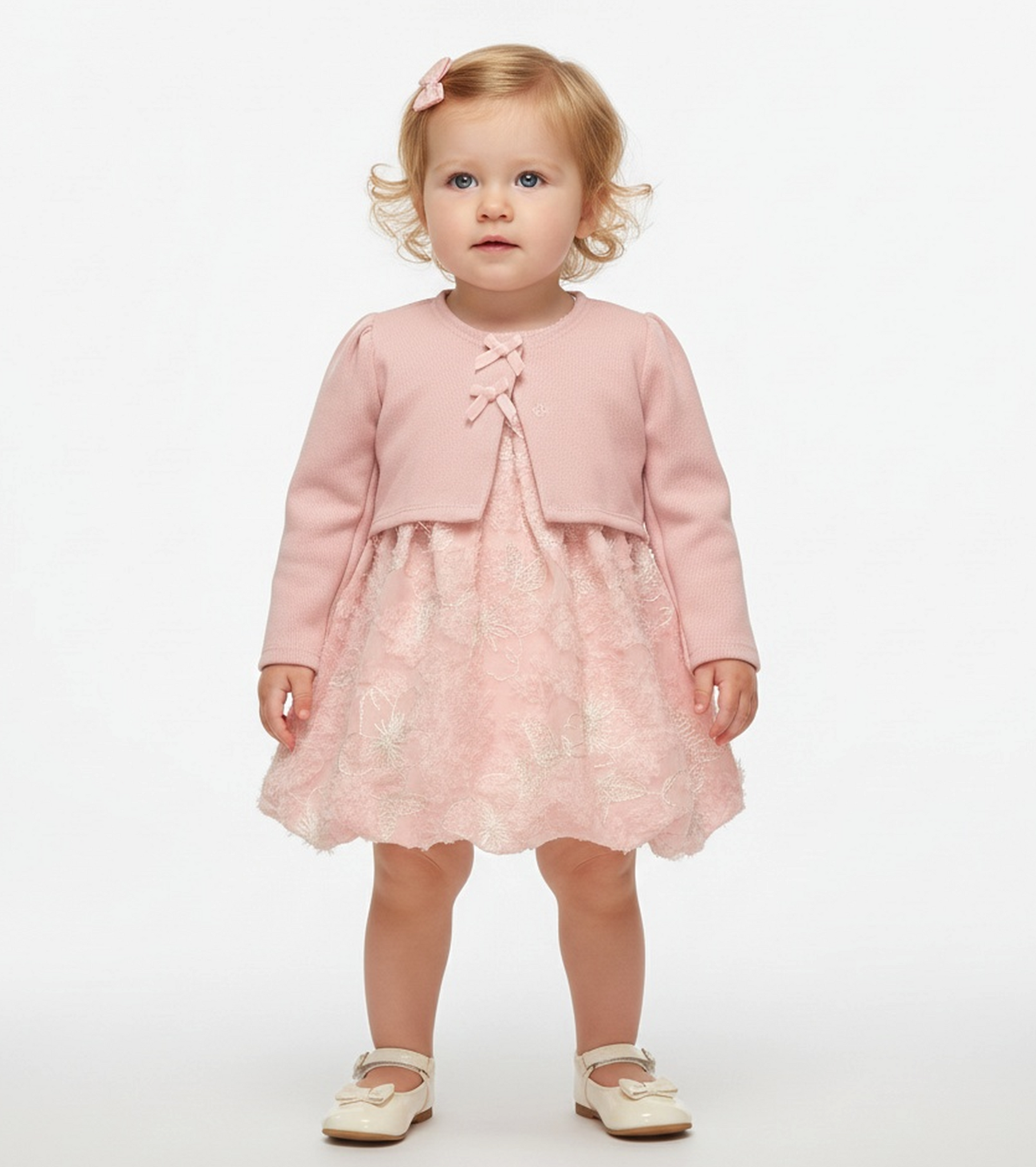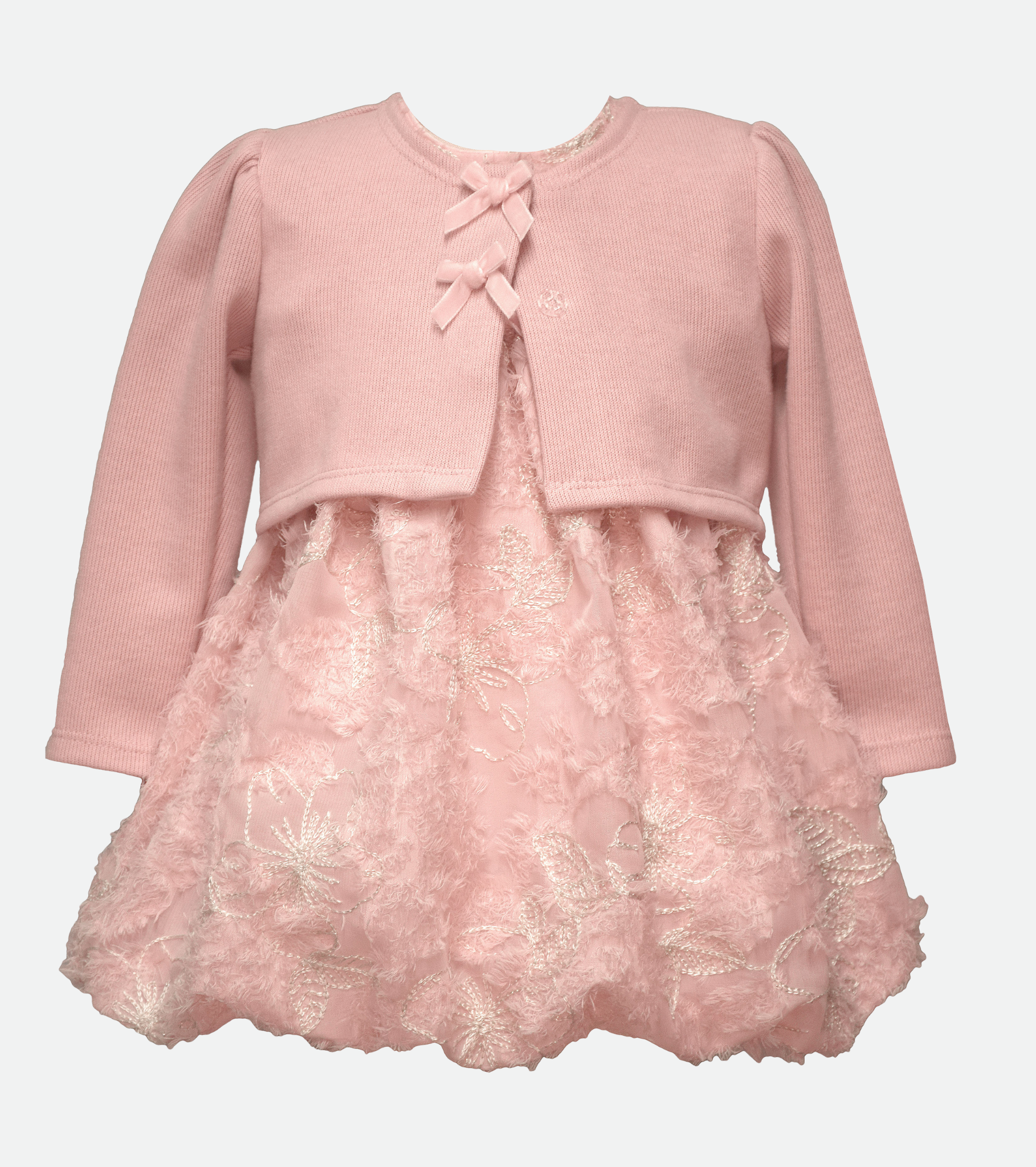 Your baby girl will look oh-so sweet in this textured floral party dress, featuring a bubble hem and coordinating long sleeve knit cardigan with bows.