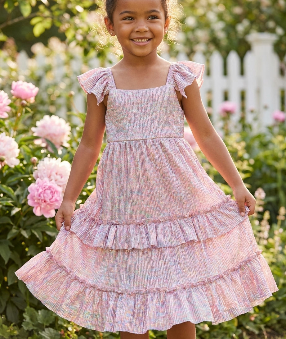 Floaty ruffles and light-catching shimmery threads keep her party ready in this standout midi dress! Featuring flutter sleeves and a twirl-worthy opalescent tiered skirt.