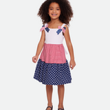 For summer barbecues, 4th of July parties and everything in between! The Betsy dress features a twirl-worthy tiered skirt and Americana bow shoulders. Matching panty in newborn and infant sizes.