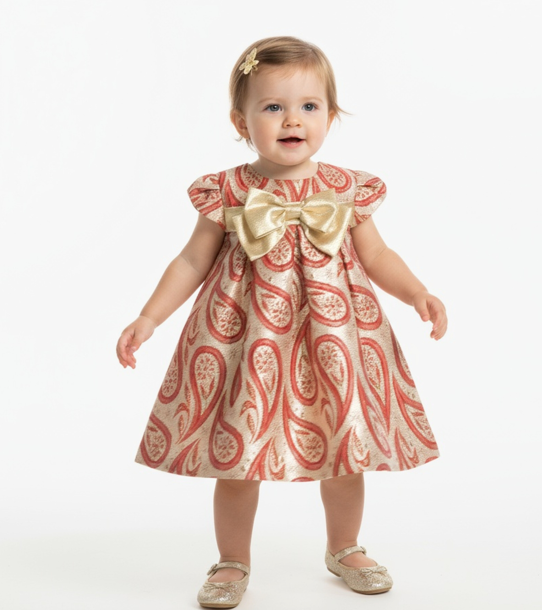 A festive party look for your baby girl, the Jordan Party Dress features a shimmery paisley jacquard print, petal sleeves, pleated skirt and a dazzling gold bow for extra charm. Matching panty included for infant and newborn sizes.