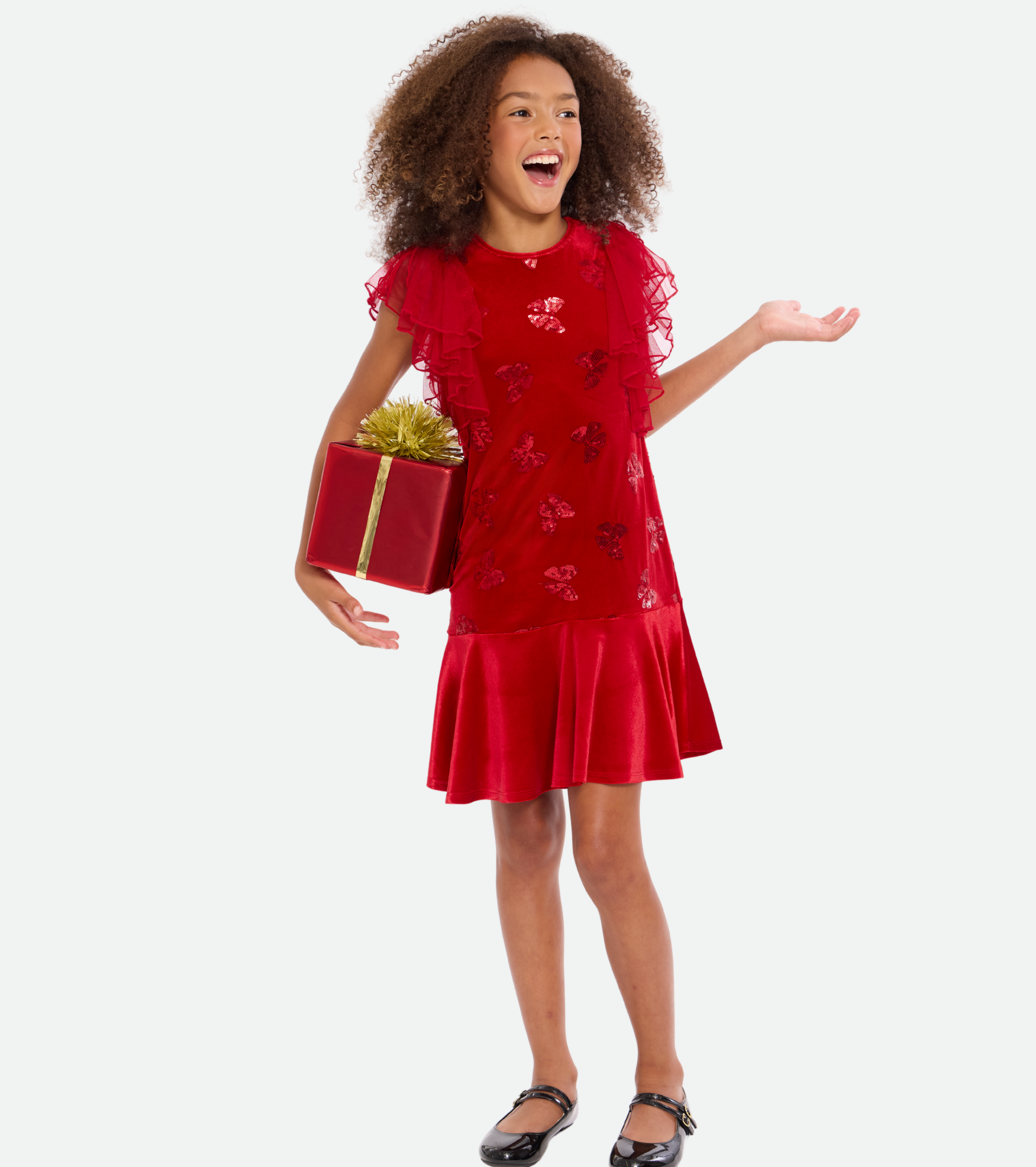A stylish choice for her next festive occasion! The Alexa Velvet Party Dress features fun sequin bows spangled long a stretch velvet chemise with ruffled purl edged sleeves and a drop waist swing skirt.