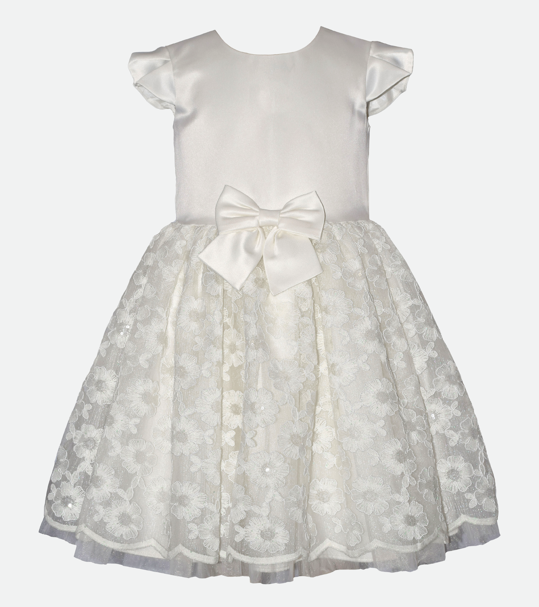 She'll feel fancy in this classic petal sleeve party dress, featuring a bridal satin bodice and a delicate floral lace skirt with embroidery and a bow at the waist.